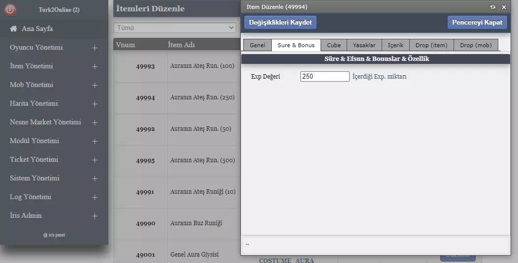 - Zindanların ayarları, kat bilgileri, zindan svanteraryosu gibi ayarlar irisAdmin Paneli üzerinden değiştirilebilir.